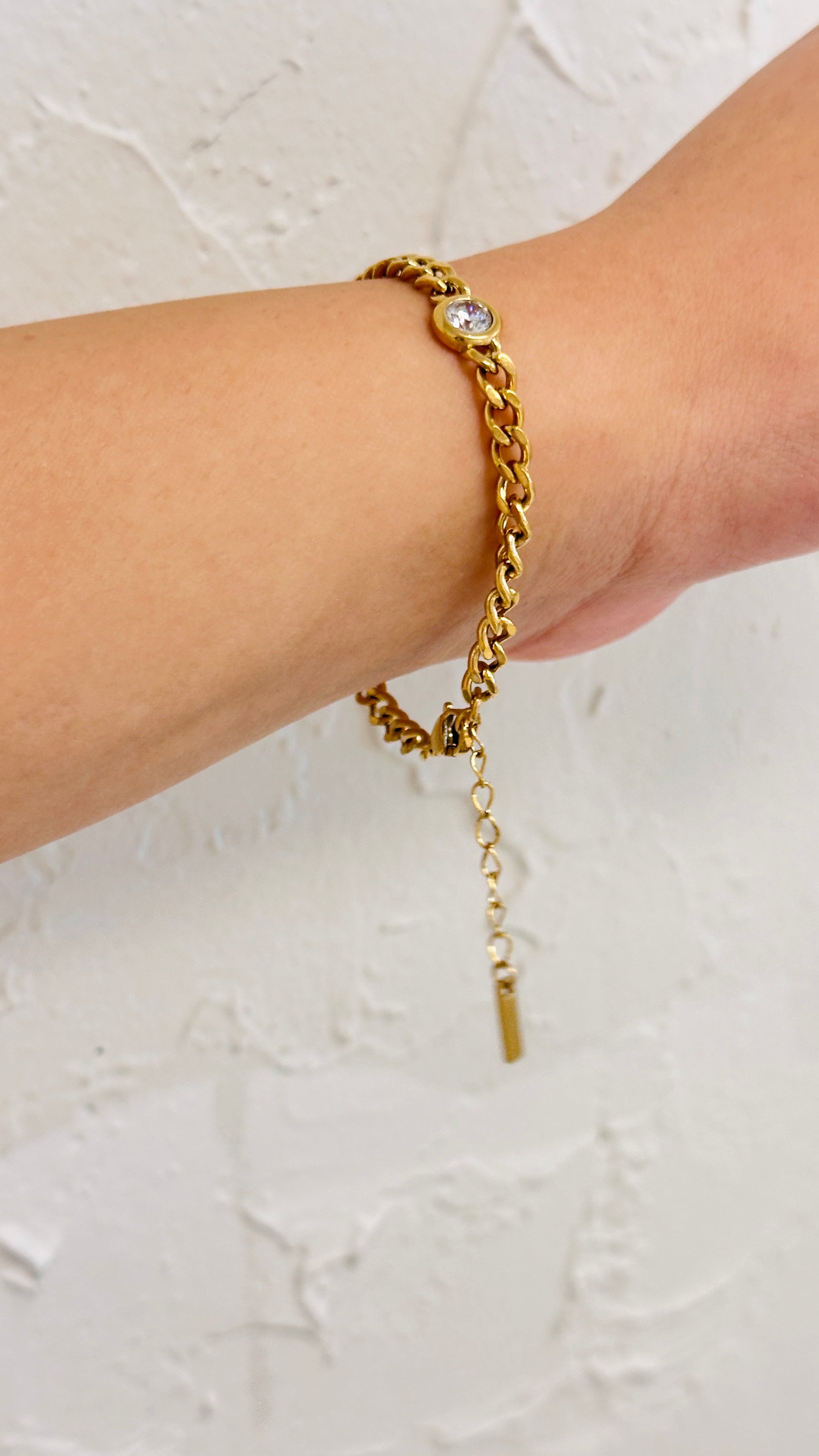 A modern classic with just the right amount of sparkle. This bracelet features sleek gold links paired with shimmering cubic zirconia accents for a refined yet versatile look. Crafted in 18K gold plated over stainless steel, it is waterproof, tarnish-free, and hypoallergenic, making it perfect for everyday wear or special occasions.