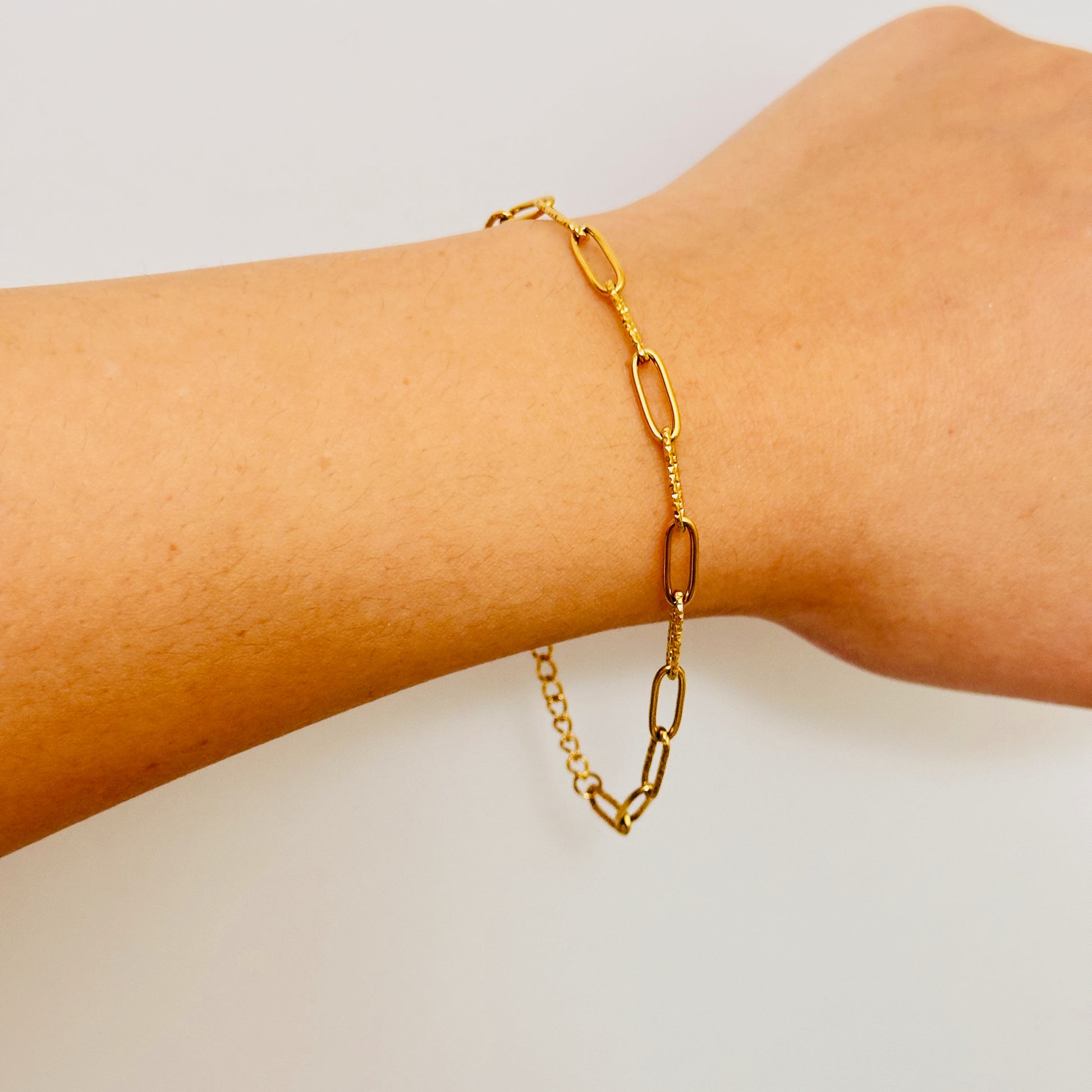 Crafted to catch the light with every movement, our Diamond Cut Link Bracelet features alternating textured links and smooth links, creating a subtle shimmer that feels both refined and eye-catching. Measuring 16 cm with a 6 cm extender, it offers a comfortable, adjustable fit perfect for stacking or wearing on its own.