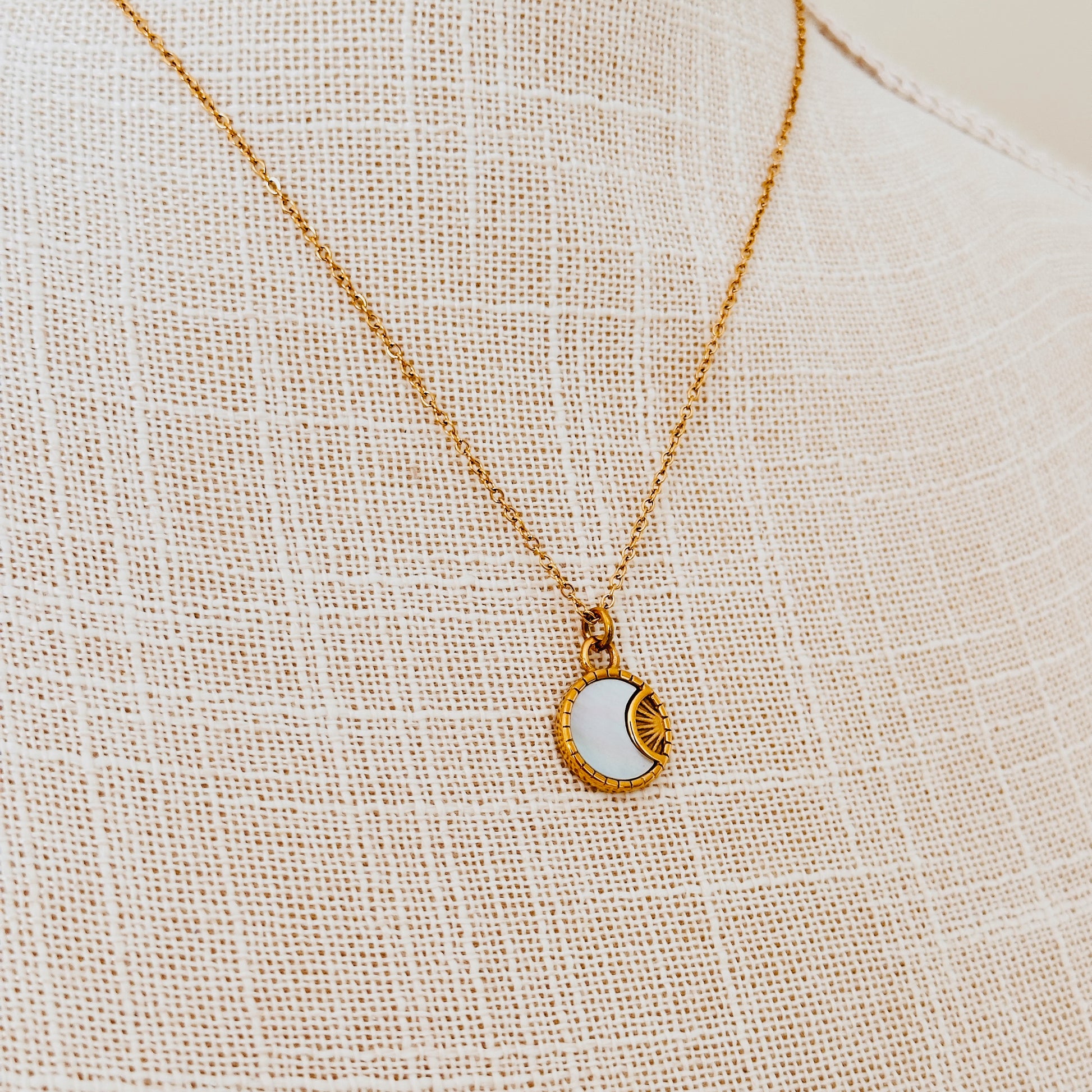 crescent moon necklace, mother of pearl moon pendant, celestial gold necklace, waterproof jewelry, hypoallergenic moon necklace, tarnish free necklace, coastal jewelry, everyday gold necklace, 18k gold PVD pendant