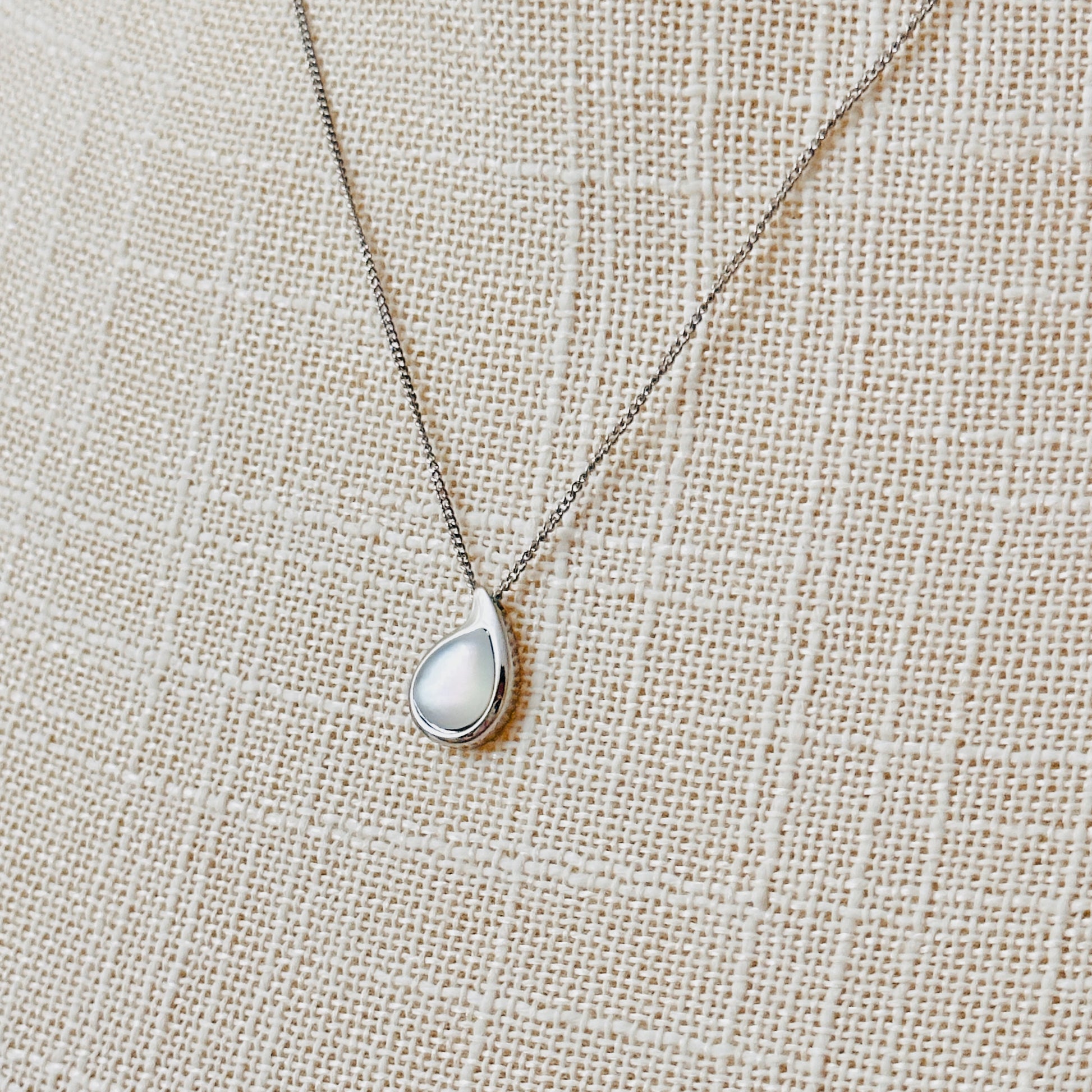 mother of pearl necklace, dew drop necklace, pearl inlay jewelry, coastal jewelry, waterproof necklace, hypoallergenic jewelry, tarnish free necklace, platinum plated jewelry, dainty necklace, layering necklace, Lucia Jewelry necklace