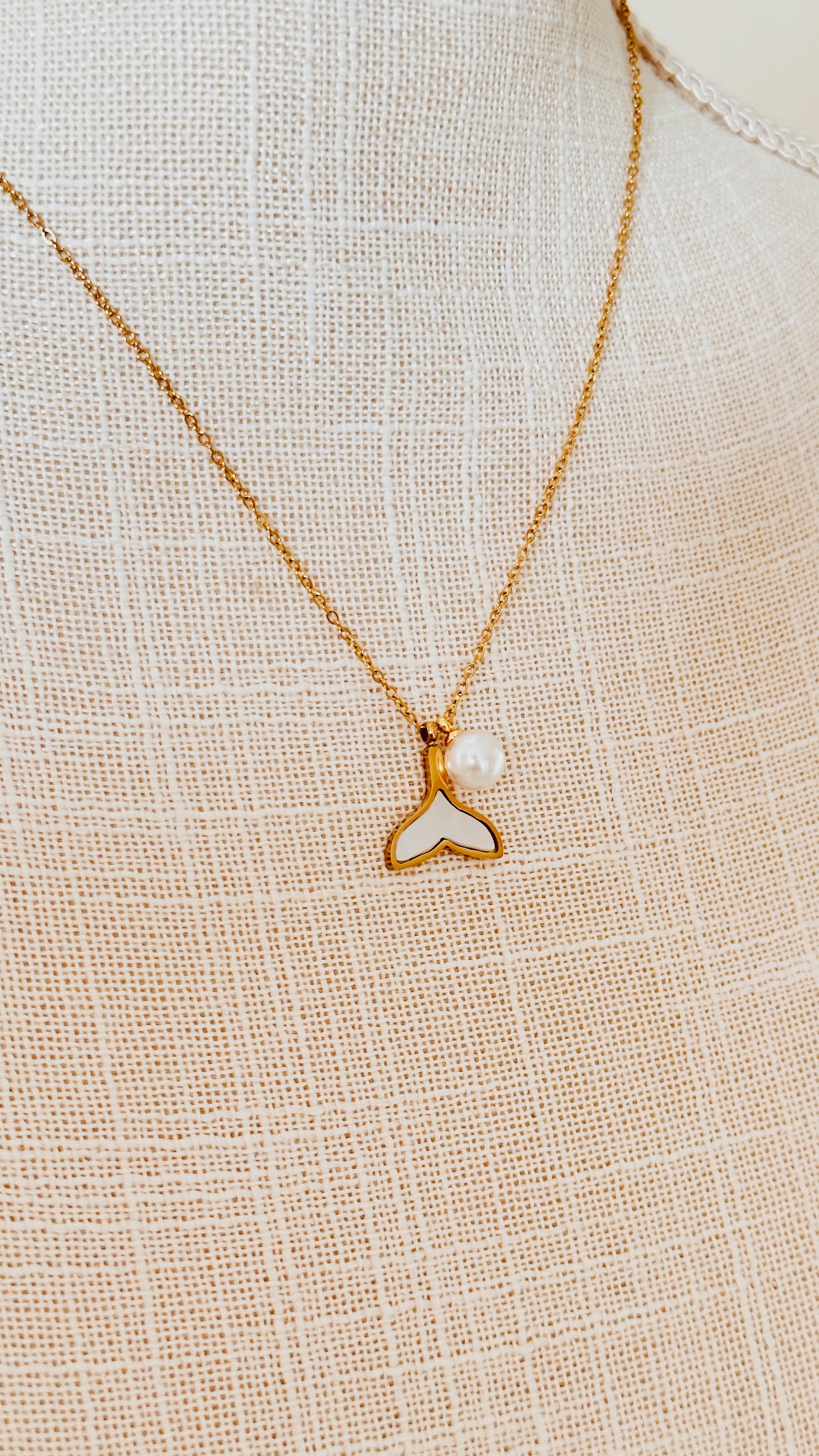 mother of pearl dolphin necklace, dolphin tail pendant, coastal jewelry necklace, waterproof gold necklace, hypoallergenic jewelry, tarnish free necklace, ocean-inspired necklace, beach jewelry, 18k gold PVD dolphin pendant, pearl accent necklace