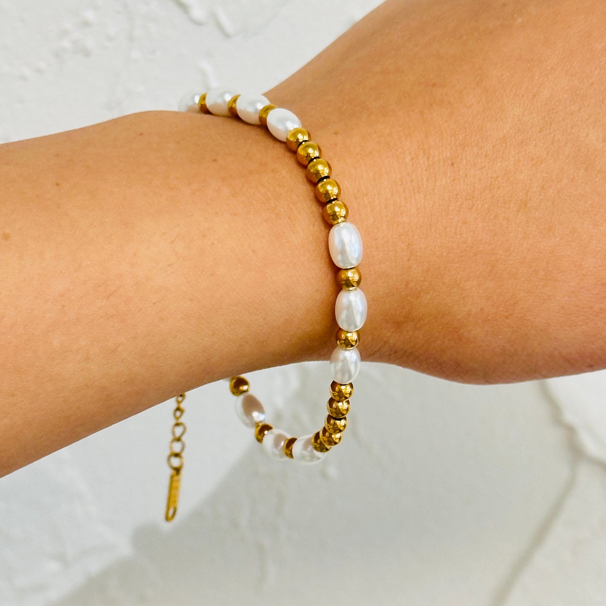Delicate and versatile, our Pearl & Gold Beaded Bracelet pairs luminous pearls with dainty gold beads for a timeless, elegant look. Designed with an easy slide extender, it adjusts for a comfortable fit with a maximum length of approximately 24 cm.