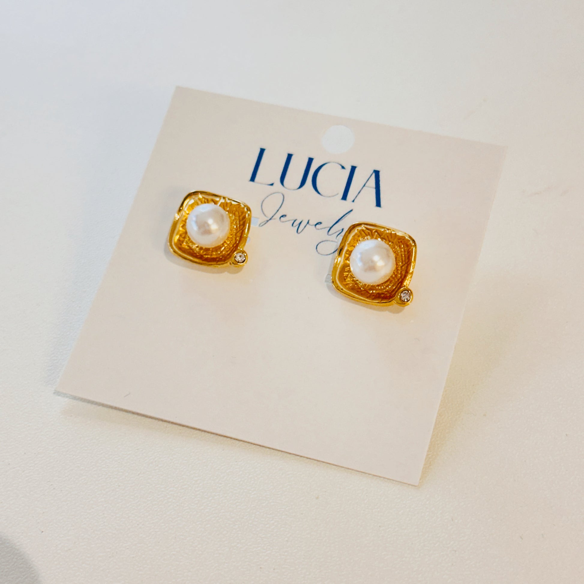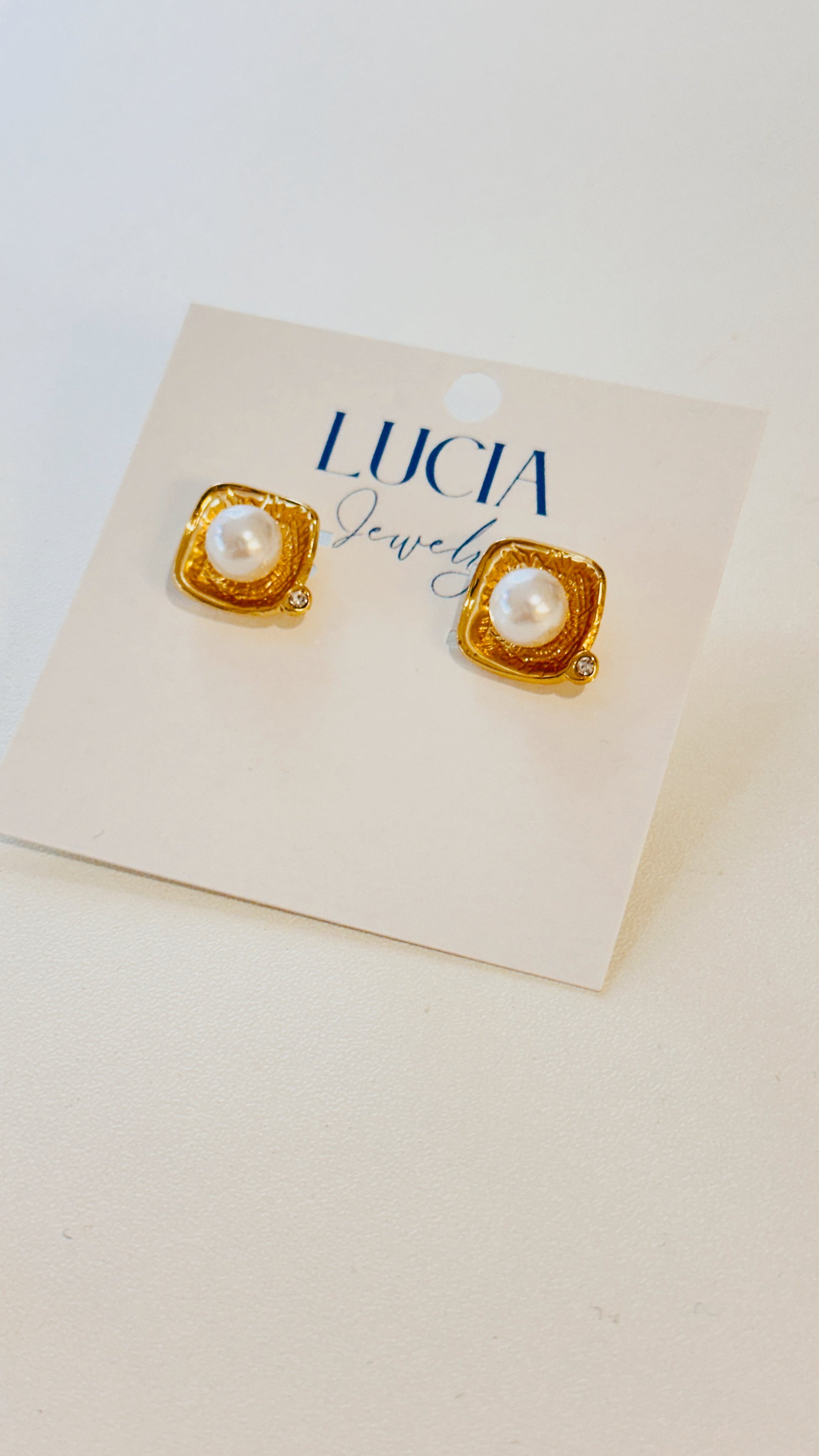 Pearl Stud Earrings, Square Stud Earrings, Gold Pearl Studs, Geometric Earrings, Cubic Zirconia Studs, Coastal Jewelry, Waterproof Earrings, Hypoallergenic Earrings, Tarnish Free Jewelry, Everyday Earrings, Minimalist Pearl Studs, Gift for Her
